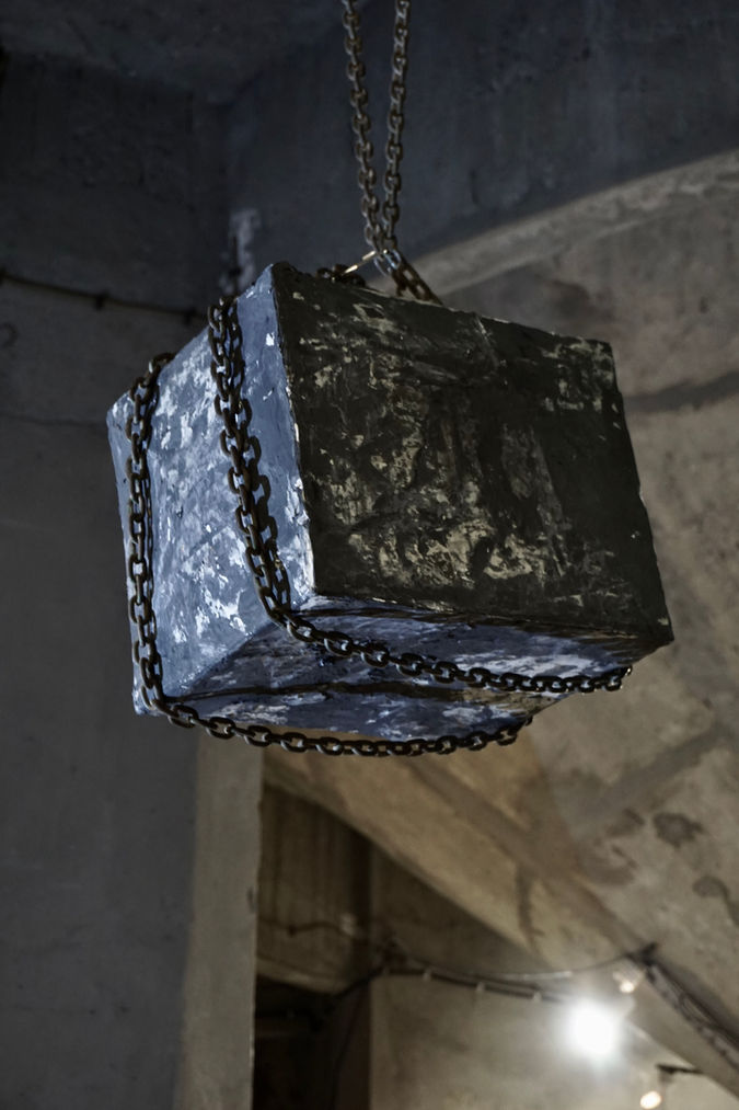 The installation combines mineral mass structures, suspended elements and controlled spatial movement to create a physical encounter with time and presence.